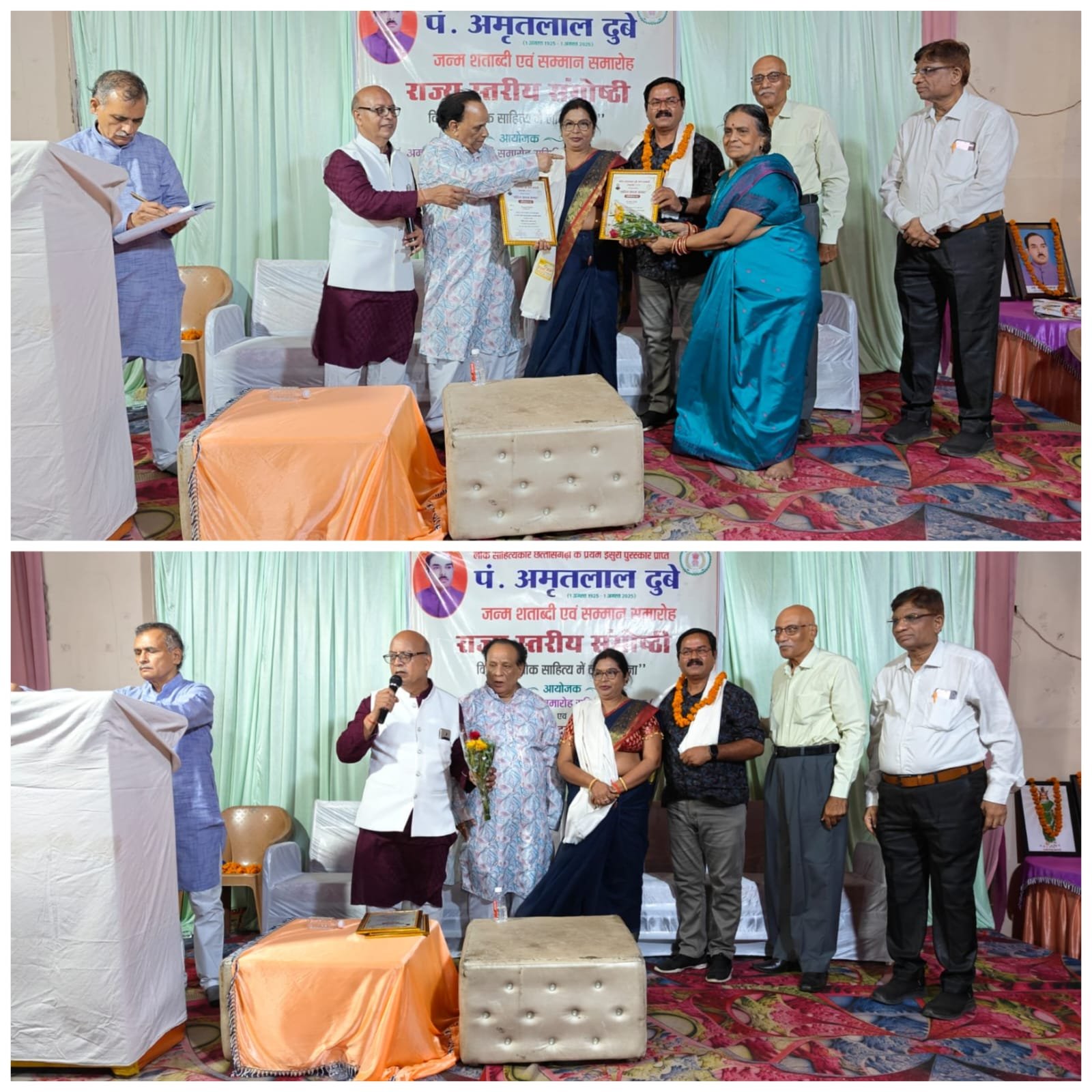 प्रख्यात लोक साहित्यकार एवं छत्तीसगढ़ी भाषा के प्रथम ईसुरी पुरस्कार से सम्मानित साहित्य साधक पंडित अमृतलाल दुबे जी की जन्म शताब्दी के अवसर पर साहित्य अकादमी छत्तीसगढ़ (छत्तीसगढ़ शासन) एवं पं. अमृतलाल दुबे जन्म शताब्दी समारोह समिति के संयुक्त तत्वावधान में एक राज्य स्तरीय संगोष्ठी, विमोचन एवं सम्मान समारोह का आयोजन संस्कार भवन, पुराना सरकंडा, बिलासपुर में भव्यता के साथ संपन्न हुआ।