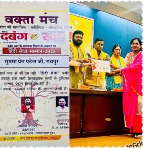 रायपुर। 28 सितम्बर 2025….वक्ता मंच (छत्तीसगढ़ प्रदेश की सामाजिक-साहित्यिक-सांस्कृतिक संस्था) एवं दैनिक दबंग स्वर के संयुक्त तत्वावधान में आज राजधानी रायपुर में आयोजित हिंदी सेवा सम्मान – 2025 समारोह में रायपुर की साहित्यकारा आ. सुषमा प्रेम पटेल को सम्मानित किया गया। यह सम्मान उन्हें “सुषमा के स्नेहिल सृजन” हिंदी भाषा के प्रति उनकी सृजनात्मक साधना, प्रेरणादायी काव्यकृतियों और समाज में हिंदी सेवा के उल्लेखनीय योगदान के लिए प्रदान किया गया।