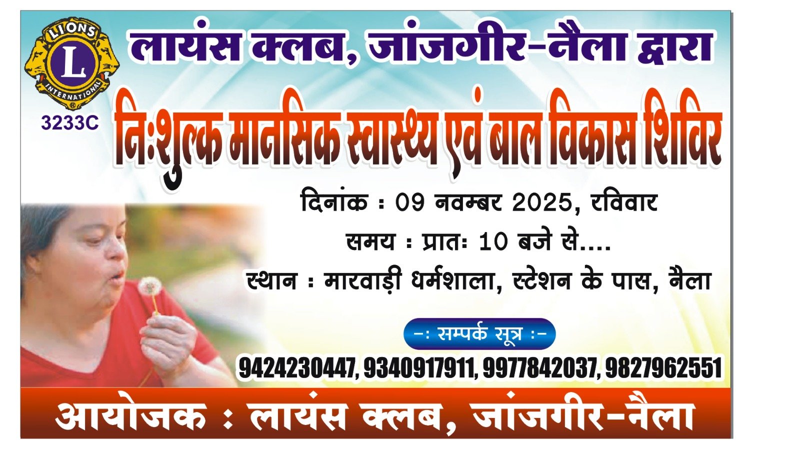 निःशुल्क मानसिक स्वास्थ एवं बाल विकास शिविर का आयोजन 9 नवंबर को(लॉयन्स क्लब जांजगीर नैला द्वारा मारवाड़ी धर्मशाला नैला में होगा आयोजन*