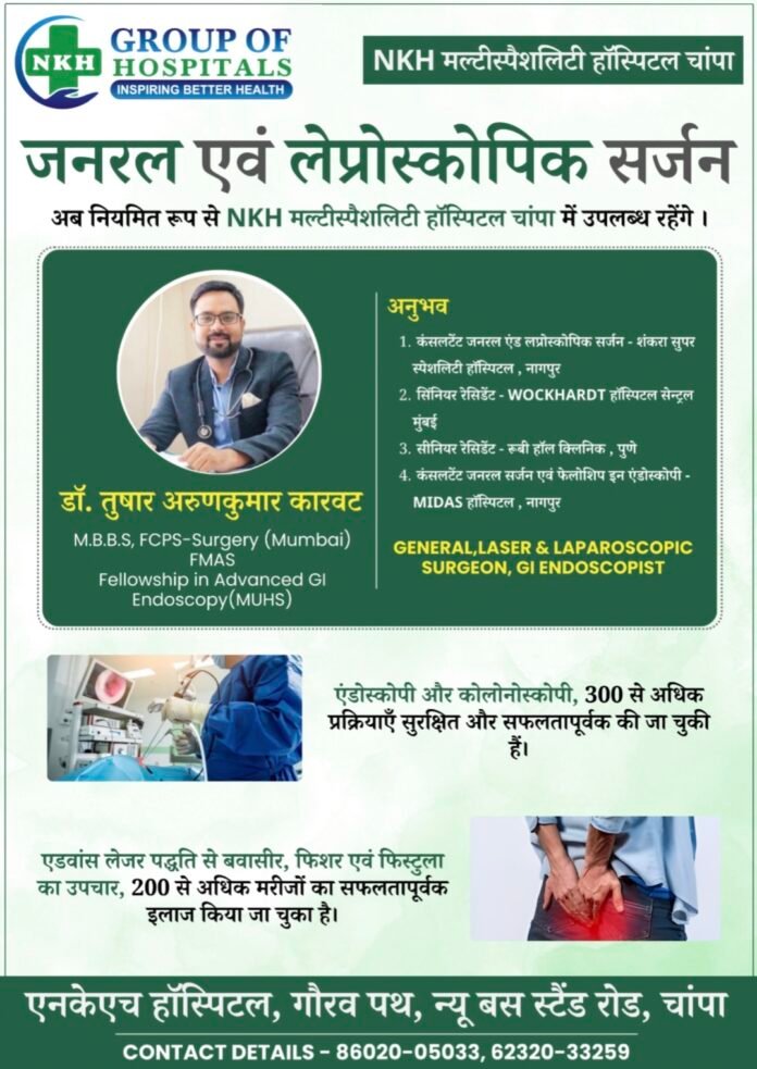 चांपा। क्षेत्र के मरीजों के लिए राहत की खबर है। अब चांपा के NKH मल्टीस्पेशियलिटी हॉस्पिटल में जनरल, लेजर एवं लेप्रोस्कोपिक सर्जरी की उन्नत सेवाएँ नियमित रूप से उपलब्ध रहेंगी। अस्पताल प्रबंधन ने बताया कि अनुभवी सर्जन डॉ. तुषार अरुणकुमार कारवट अब चांपा में अपनी विशेष सेवाएँ देंगे। मरीजों को अब जटिल सर्जिकल इलाज के लिए बड़े शहरों की ओर रुख नहीं करना पड़ेगा।