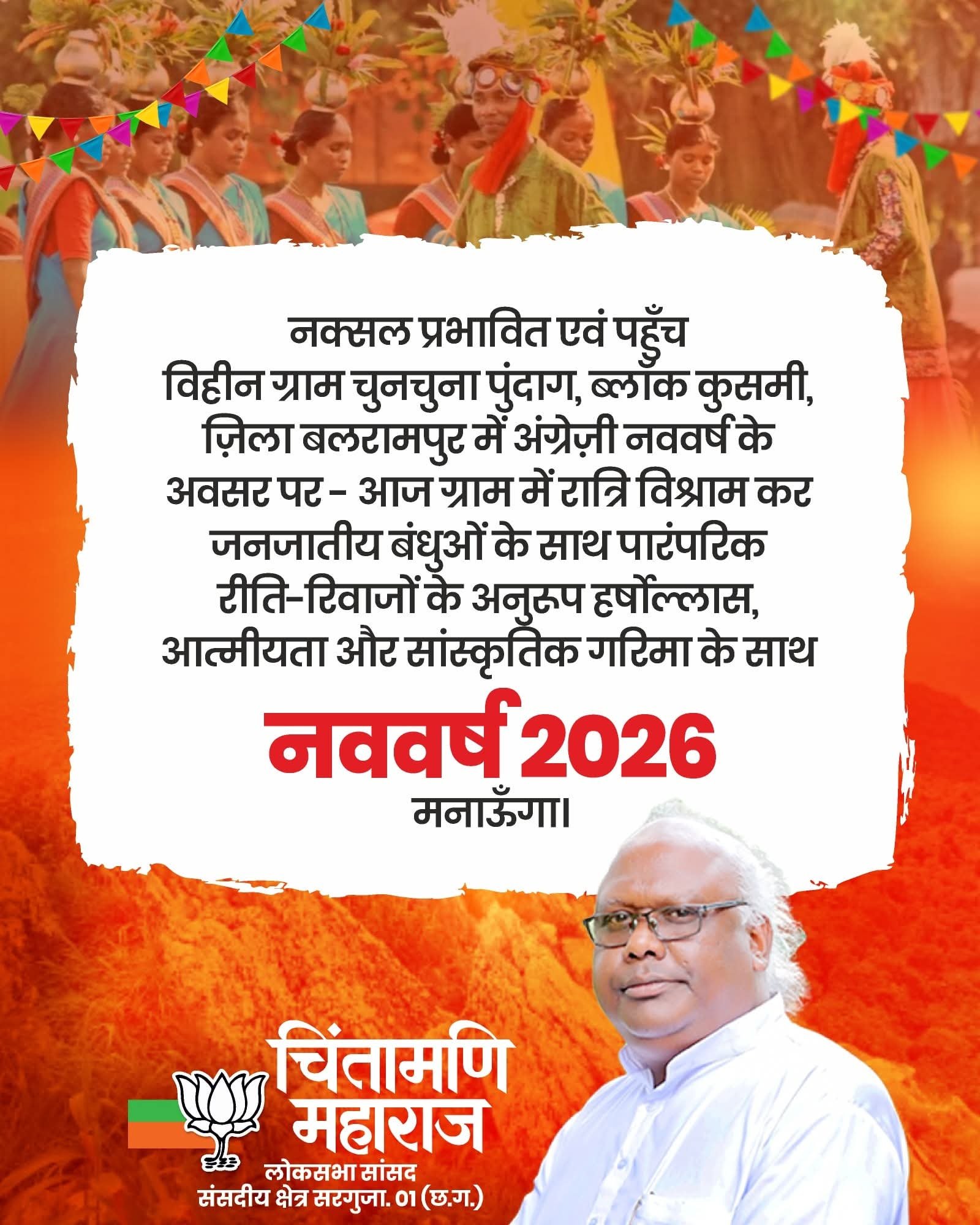 कुसमी विकासखंड के नक्सल प्रभावित एवं पहुँचविहीन ग्राम चुनचुना पुंदाग में अंग्रेज़ी नववर्ष को इस बार एक ऐतिहासिक और भावनात्मक पहल के रूप में मनाया जा रहा है। नववर्ष के अवसर पर सांसद चिंतामणि महाराज ग्राम में रात्रि विश्राम कर जनजातीय समाज के बीच रहेंगे और पारंपरिक रीति-रिवाजों के अनुरूप हर्षोल्लास, आत्मीयता एवं सांस्कृतिक गरिमा के साथ नववर्ष का स्वागत करेंगे।