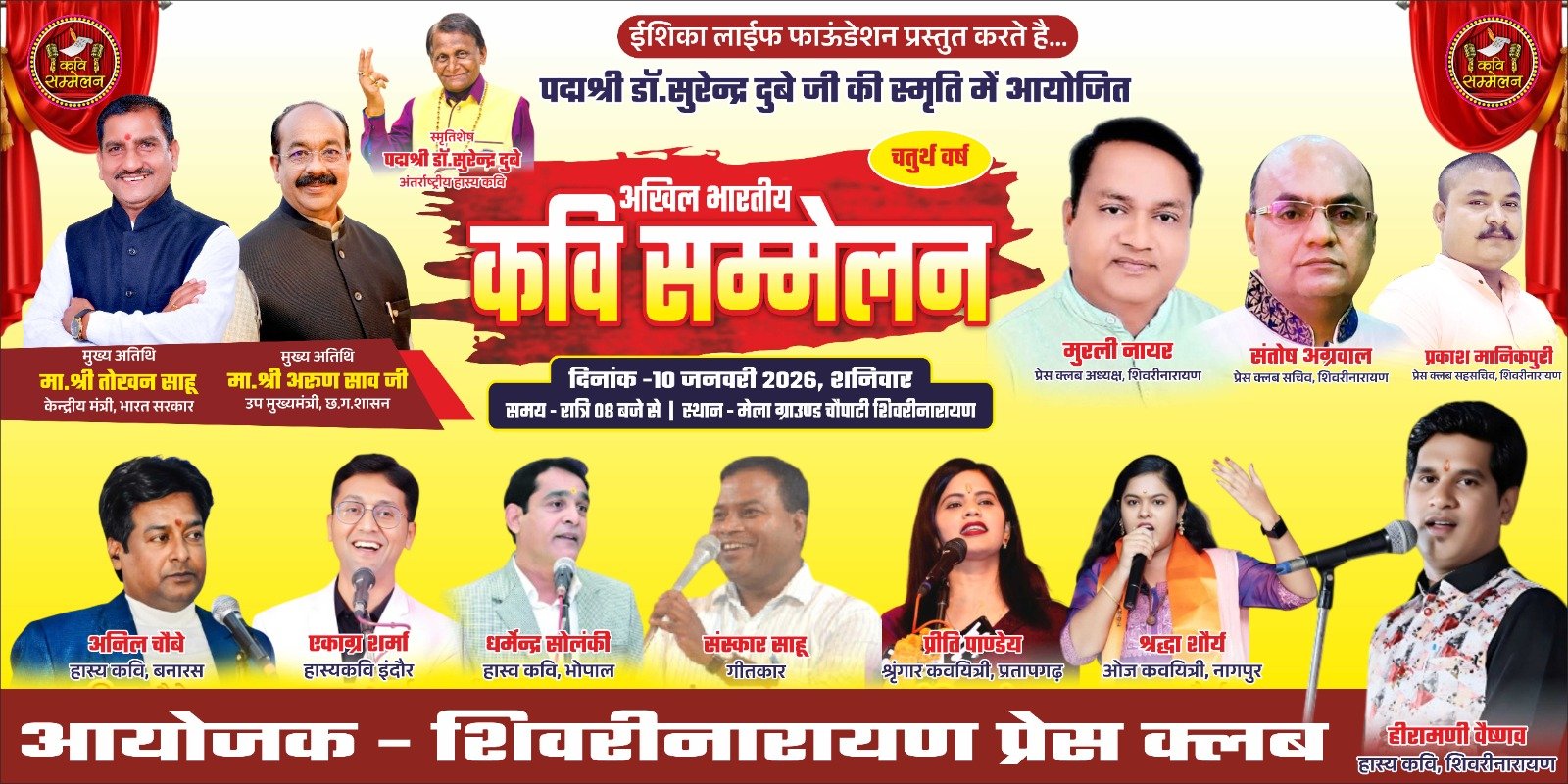 शिवरीनारायण। अंतरराष्ट्रीय ख्याति प्राप्त हास्य कवि, प्रखर व्यंग्यकार एवं पद्मश्री सम्मानित डॉ. सुरेंद्र दुबे की पुण्य स्मृति में 10 जनवरी 2026, शनिवार को शिवरीनारायण के मेला ग्राउंड चौपाटी में भव्य अखिल भारतीय हास्य कवि सम्मेलन का आयोजन किया जा रहा है। यह आयोजन ईशिका लाइफ फाउंडेशन एवं शिवरीनारायण प्रेस क्लब के संयुक्त तत्वावधान में आयोजित होगा। उल्लेखनीय है कि वर्ष 2010 में डॉ. सुरेंद्र दुबे को साहित्य के क्षेत्र में उनके अतुलनीय योगदान के लिए पद्मश्री सम्मान से अलंकृत किया गया था। आयोजन का संदेश “Tiger अभी ज़िंदा है” डॉ. दुबे की लेखनी, हास्य और व्यंग्य की आज भी जीवंत उपस्थिति को दर्शाता है। प्रेस क्लब के सचिव संतोष अग्रवाल ने बताया कि यह आयोजन अपने चतुर्थ वर्ष में प्रवेश कर रहा है। उन्होंने कहा कि अपने जीवनकाल में डॉ. सुरेंद्र दुबे स्वयं प्रत्येक वर्ष 10 जनवरी को शिवरीनारायण में कवि सम्मेलन आयोजित किया करते थे। उनके निधन के बाद भी उसी साहित्यिक परंपरा को जीवित रखते हुए यह आयोजन निरंतर उनकी स्मृति में किया जा रहा है।