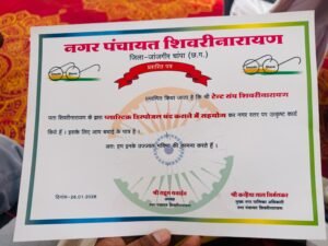 शिवरीनारायण। नगर पंचायत शिवरीनारायण, जिला–जांजगीर-चांपा द्वारा स्वच्छता अभियान में उल्लेखनीय योगदान देने पर टेंट संघ शिवरीनारायण को गणतंत्र दिवस के अवसर पर प्रशस्ति पत्र एवं मोमेंटो प्रदान कर सम्मानित किया गया। यह सम्मान 26 जनवरी 2026 को नगर को स्वच्छ, सुंदर एवं पर्यावरण अनुकूल बनाए रखने की दिशा में संघ की सक्रिय भूमिका के लिए दिया गया। नगर पंचायत द्वारा जारी प्रशस्ति पत्र में उल्लेख किया गया कि स्वच्छ भारत मिशन के अंतर्गत टेंट संघ शिवरीनारायण ने प्लास्टिक मुक्त अभियान को सफल बनाने में महत्वपूर्ण योगदान दिया है।