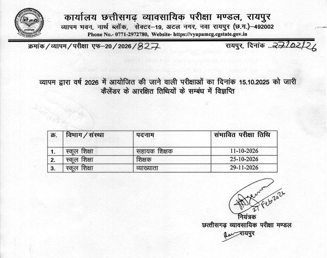 मुख्यमंत्री श्री साय ने कहा कि व्यापम द्वारा वर्ष 2026 में आयोजित होने वाली शिक्षक भर्ती परीक्षाओं की संभावित तिथियां जारी कर दी गई हैं। निर्धारित कार्यक्रम के अनुसार सहायक शिक्षक की परीक्षा 11 अक्टूबर 2026, शिक्षक की परीक्षा 25 अक्टूबर 2026 तथा व्याख्याता की परीक्षा 29 नवंबर 2026 को संभावित है।मुख्यमंत्री श्री साय ने सभी अभ्यर्थियों को तैयारी के लिए शुभकामनाएं देते हुए कहा कि परिश्रम, लगन और आत्मविश्वास के साथ किया गया प्रयास निश्चित रूप से सफलता दिलाता है। उन्होंने कहा कि युवा प्रदेश के भविष्य निर्माण में महत्वपूर्ण भूमिका निभाएंगे और शिक्षा के माध्यम से नई पीढ़ी को सशक्त बनाने में योगदान देंगे। मुख्यमंत्री श्री साय ने सभी अभ्यर्थियों के उज्ज्वल भविष्य की कामना करते हुए उन्हें हार्दिक शुभकामनाएं दीं।